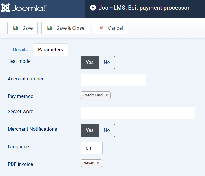 Secret word: enter your Secret Key (also located in your 2Checkout dashboard under "Integrations" > "Webhooks and API"). This key ensures that all communication between JoomLMS and 2Checkout is securely authenticated.