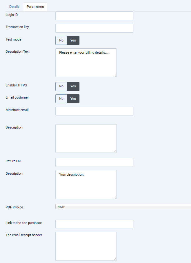 For each payment processor you can configure a number of parameters. The Details tab allows you to define basic settings for the payment processor: